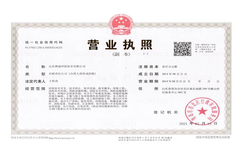 山東博通環(huán)保技術有限公司是一家專業(yè)從事環(huán)保、安全、消防的多元化技術服務公司,公司致力于打造專業(yè)的技術服務團隊,立足青島,輻射山東,服務范圍涵蓋:環(huán)保技術開發(fā)、技術轉讓、技術咨詢、技術服務;環(huán)保工程;消防技術咨詢;消防設施檢測;消防安全評估;消防設施維護保養(yǎng);環(huán)境應急預案咨詢;安全生產(chǎn)標準化咨詢;場地環(huán)境調查報告編制,土壤與地下水環(huán)境調查及風險評估,水土保持方案編制,水土保持過程監(jiān)測,水土保持驗收工程,排污許可申報代理,清潔生產(chǎn)審核;...